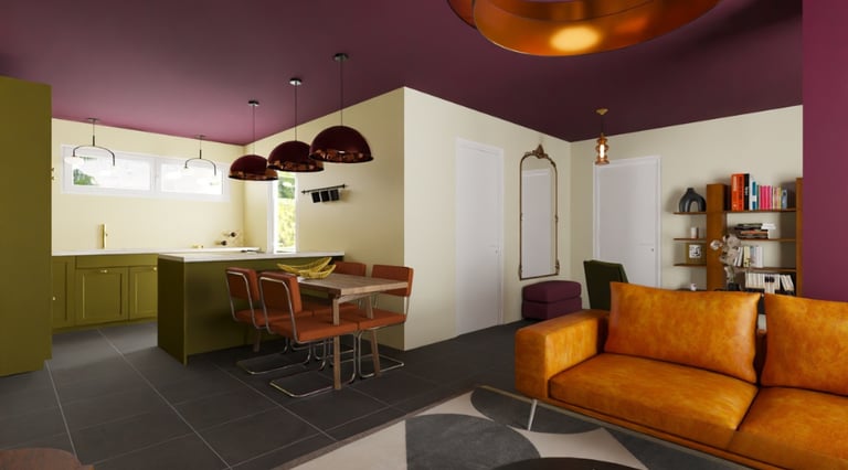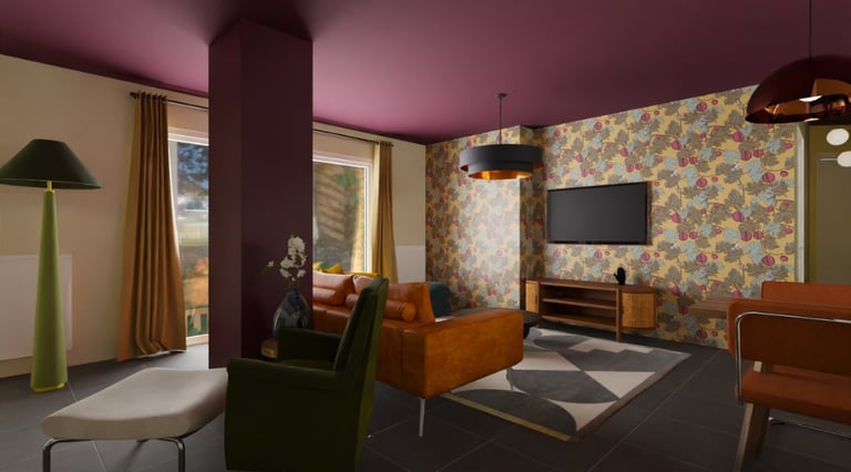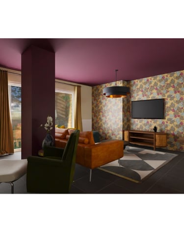 Cette décoration audacieuse mêle des couleurs profondes et chaleureuses à des touches vintage et florales, créant un intérieur de caractère à la fois élégant, convivial et original.