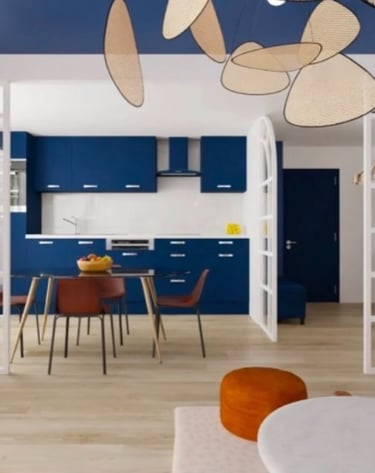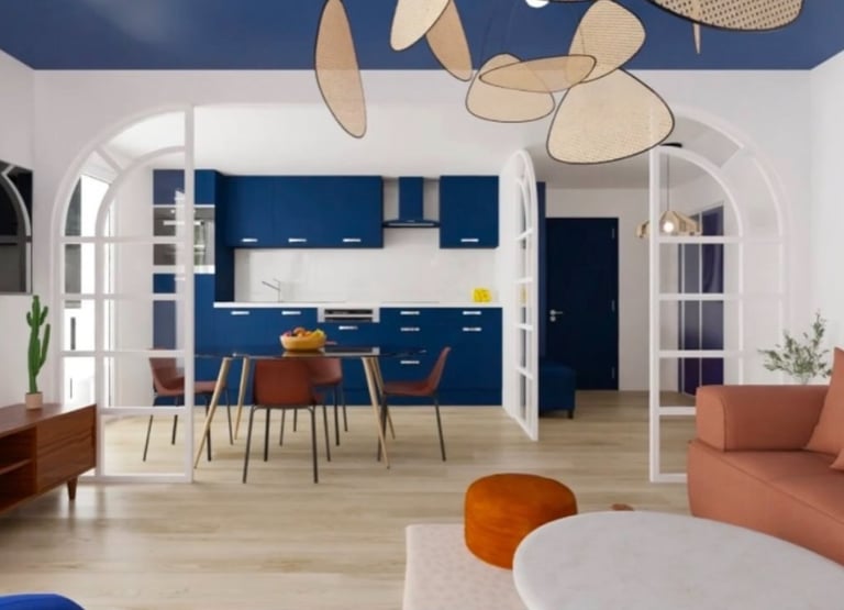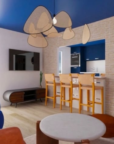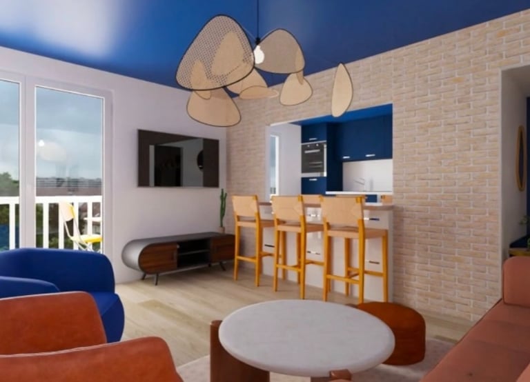Les nuances de bleu associées à une ambiance marine apportent fraîcheur et évasion, créant un intérieur apaisant et lumineux inspiré du bord de mer.